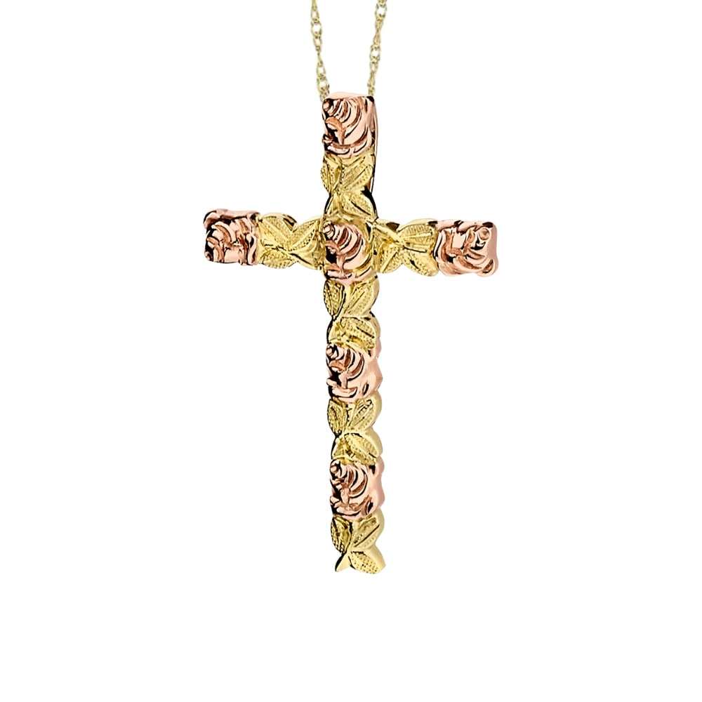 Rose and Leaf Pink and Green Gold Cross Pendant