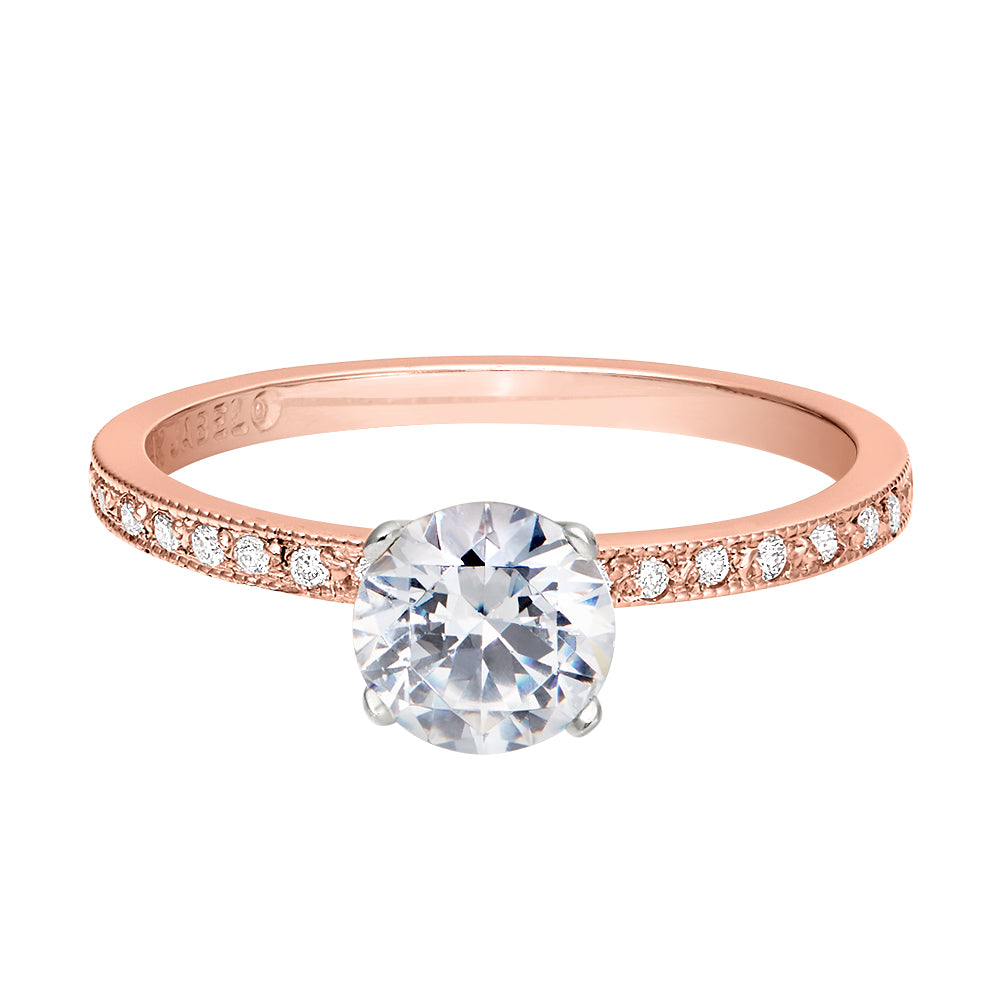 Our most romantic designs can be found in our collection of vintage style engagement rings. While these are new rings, their detailing is reminiscent of authentic vintage rings. Their convincing appearance comes from using antique motifs and old-world techniques. Our most popular vintage details are engraved flowers and milgraining, also called beading or coin edging. Some designs are hand engraved while others come from die striking or rolling. Also, we offer a limited collection of vintage style illusion and fishtail prong settings. Together, these details bring the simplest of rings alive to resemble antique engagement rings.