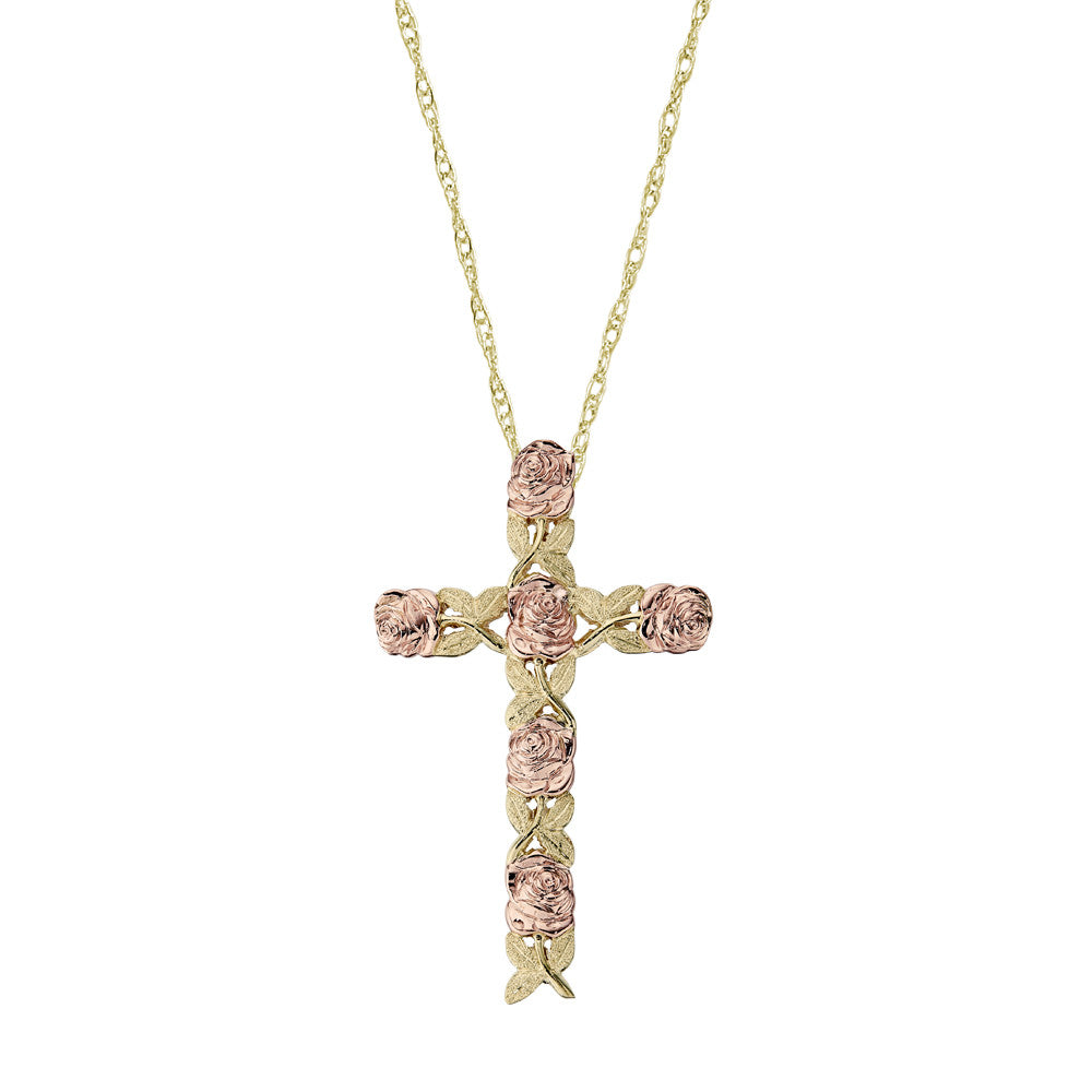 Rose and Leaf Pink and Green Gold Cross Pendant