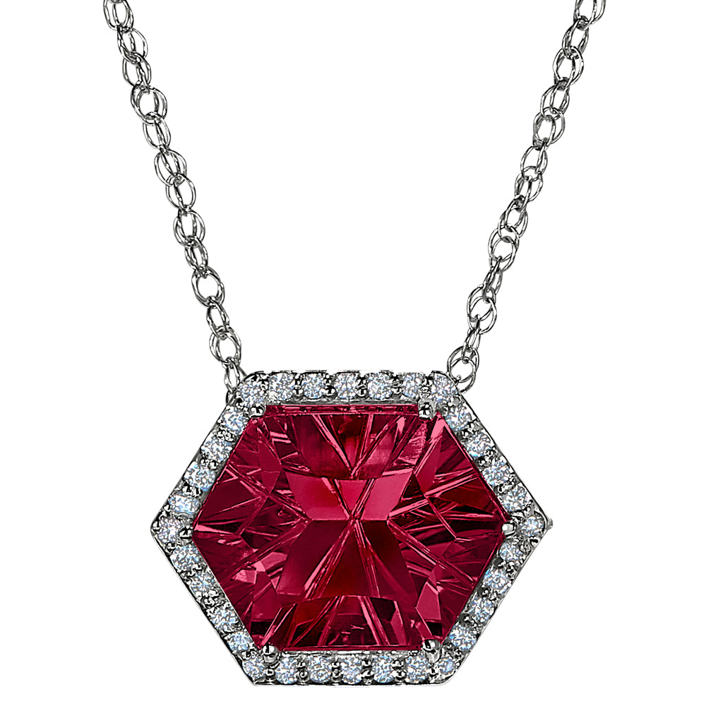 Halo Concave Hexagon Rhodolite and Diamond Necklace Worn Two Ways
