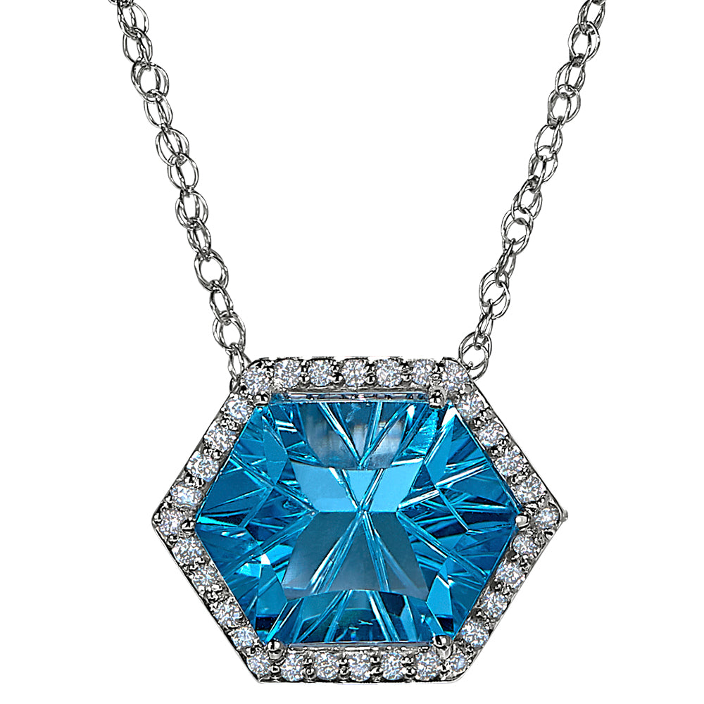 Halo Concave Hexagon Swiss Blue Topaz and Diamond Necklace Worn Two Ways