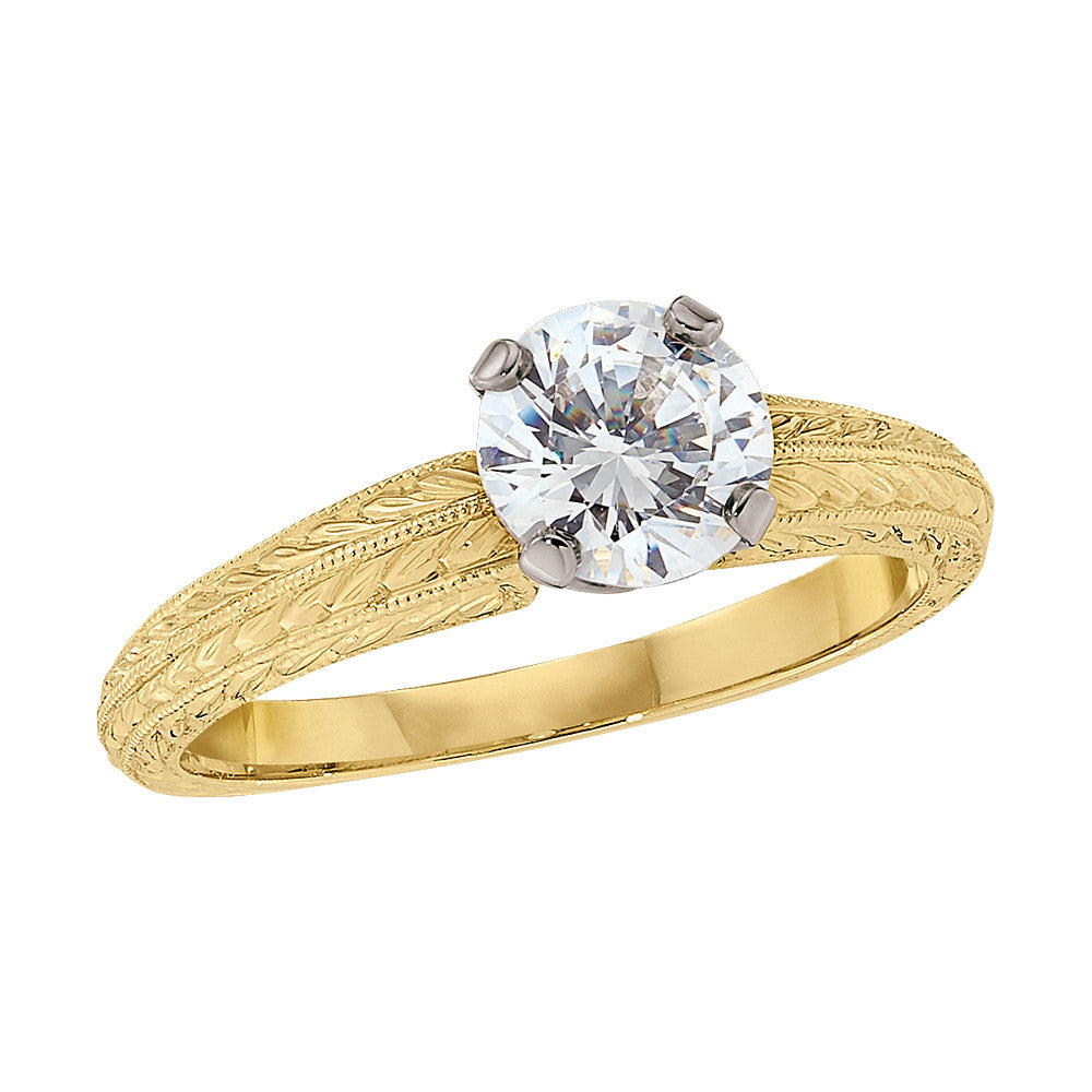 Our collection of vintage engagement rings also include gold solitaire rings. The collection features an antique reproduction engagement ring, crafted using a die that was introduced in 1925. The design features a dynamic ribbon design, draped down the band with realistic details. Additionally, we have several vintage-style engagement rings with romantic detailing such as milgraining, also called a coin edge or beading, hand engraving, and floral motifs including rose, flower, and palm details. These unique gold solitaire rings are truly romantic.