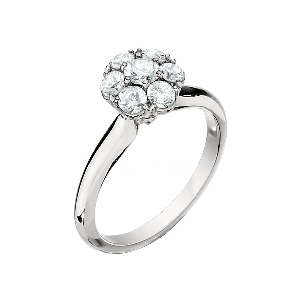 Diamond clusters are excellent unique diamond engagement rings. Historically, diamond cluster engagement rings were invented as an alternative to diamond solitaires. The grouping of smaller diamonds in the footprint of a round or oval silhouette allows shoppers to use more affordable diamonds while still achieving the size and look of a single-stone setting. Our collection of Jabel diamond cluster engagement rings honors that history, while offering an heirloom quality alternative to other diamond cluster settings through their unique die-struck and domed setting.